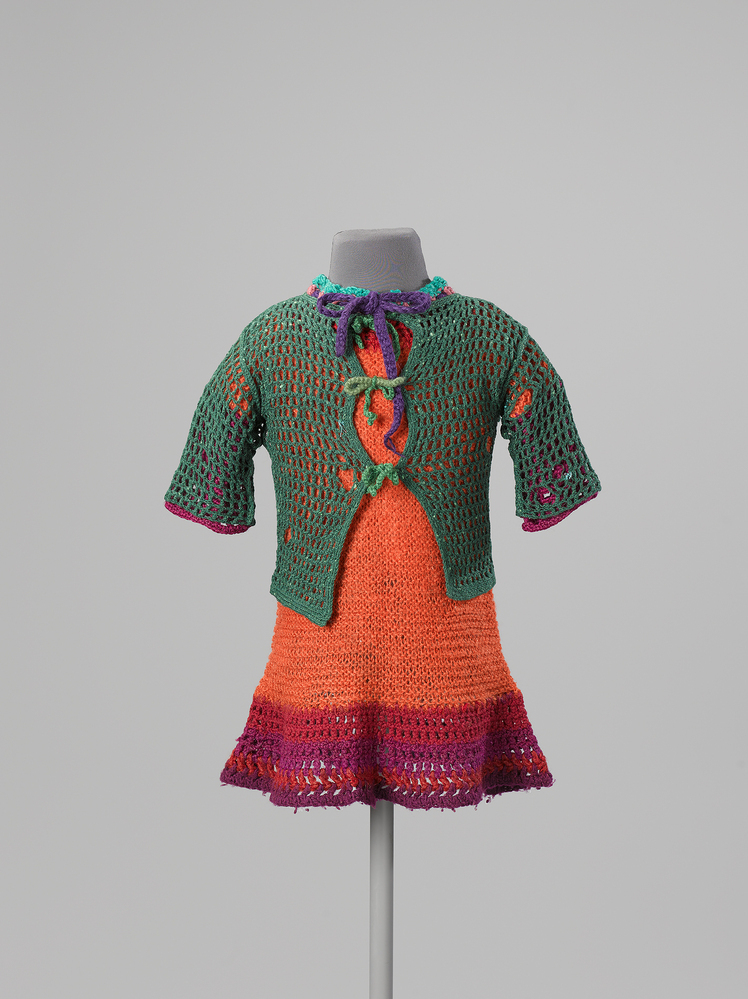 Oranje/bruin lijfje van jurk gebreid. Paars, rood en groene randen langs mouwen, hals en onderzoom gehaakt. Door de hals een paars strikkoord geregen.