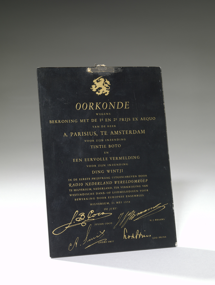 opschrift op voorzijde: OORKONDE/ WEGENS/ BEKRONING MET DE 1E EN 2E PRIJS EX AEQUO/ VAN DE HEER/ A. PARSIUS, TE AMSTERDAM/ VOOR ZIJN INZENDING/ TINTIE BOTO/ EN/ EEN EERVOLLE VERMELDING/ VOOR ZIJN INZENDING/ DING WINTJI/ IN DE EERSTE PRIJSVRAAG UITGESCHREVEN DOOR/ RADIO NEDERLAND WERELDOMROEP/ TE HILVERSUM, NEDERLAND, TER VERKRIJGING VAN/ WESTINDISCHE DANS- OF LIEDMELODIEEN VOOR/ BEWER DOOR EUROPESE ENSEMBLES. HILVERSUM, 21 MEI 1958/ DE JURY JULIAN COCO H.J. BRAAMS ANDRE SMIT LOD. PRINS: afbeelding van een staande leeuw/in goud op zwart