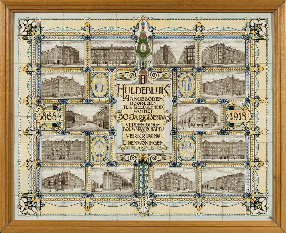 Een tegeltableau is een vlak, bestaande uit meerdere aardewerken tegels, die door een schildering één voorstelling vormen. Tegeltableaus werden vanaf de zeventiende eeuw populair, omdat ze zowel decoratief als functioneel waren. Ze boden uitkomst tegen vocht, waar huisjes langs grachten en kanalen nogal eens last van hadden, en waren gemakkelijk schoon te houden. Daarnaast zorgden de uit Italië afkomstige vormen, kleuren en motieven voor een vrolijke aanblik rond de haard of in de gang. In de periode van de Jugendstil (ca. 1900) leefde de aandacht voor tegeltableaus opnieuw op. Families en bedrijven die het zich konden veroorloven, lieten wanden, gevels en portieken versieren met tegeltableaus in Art Nouveau stijl. Ook voor jubilea en andere feestelijke gelegenheden werden soms tegeltableaus vervaardigd. Dit tegeltableau is door Plateelbakkerij Delft N.V. vervaardigd ter gelegenheid van het vijftigjarig bestaan van Vereeniging Bouwmaatschappij tot Verkrijging van Eigen Woningen in 1918. ( Sarah Remmerts de Vries)