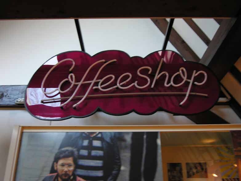 Gevelreclame in de vorm van een hardroze wolk. Tekst in witte neon-letters: COFFEESHOP- Trefwoorden