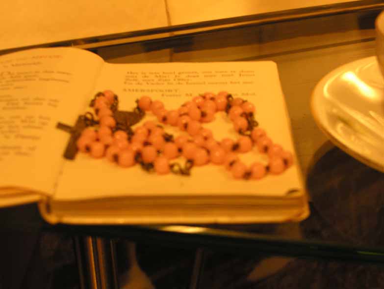 Een rozenkrans is een gebedssnoer dat in de Rooms-Katholieke Kerk gebruikt wordt bij het uitvoeren van het rozenkransgebed. Elke rozenkrans is opgebouwd uit vijf grote en vijftig kleinere kraaltjes. Deze getallen komen overeen met de vijf Onzevaders en vijftig Weesgegroetjes die men bidt als men de krans eenmaal doorloopt. Bij een volledig rozenkransgebed doorloopt men de krans driemaal achter elkaar. Deze rozenkrans bestaat uit roze glazen kraaltjes en een metalen ketting met hanger in de vorm van een kruisje. De krans is geweest van Gemma van Thienen (1954). Gemma groeide op in een katholiek gezin in Amsterdam-Noord. Samen met haar zusje ging ze naar de Augustinusschool, waar ze catechismus kreeg. Op 6 mei 1962 deed Gemma haar Eerste Heilige Communie. ( Sarah Remmerts de Vries)