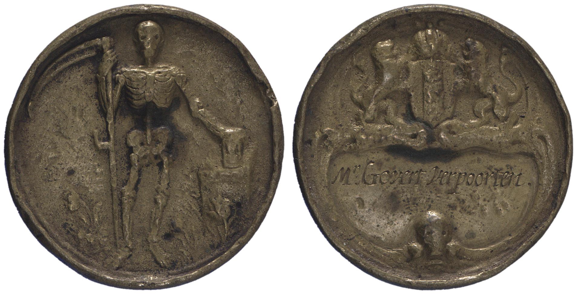 keerzijde: Wapen van Amsterdam, gehouden door twee leeuwen, waaronder een cartouche met doodshoofd.