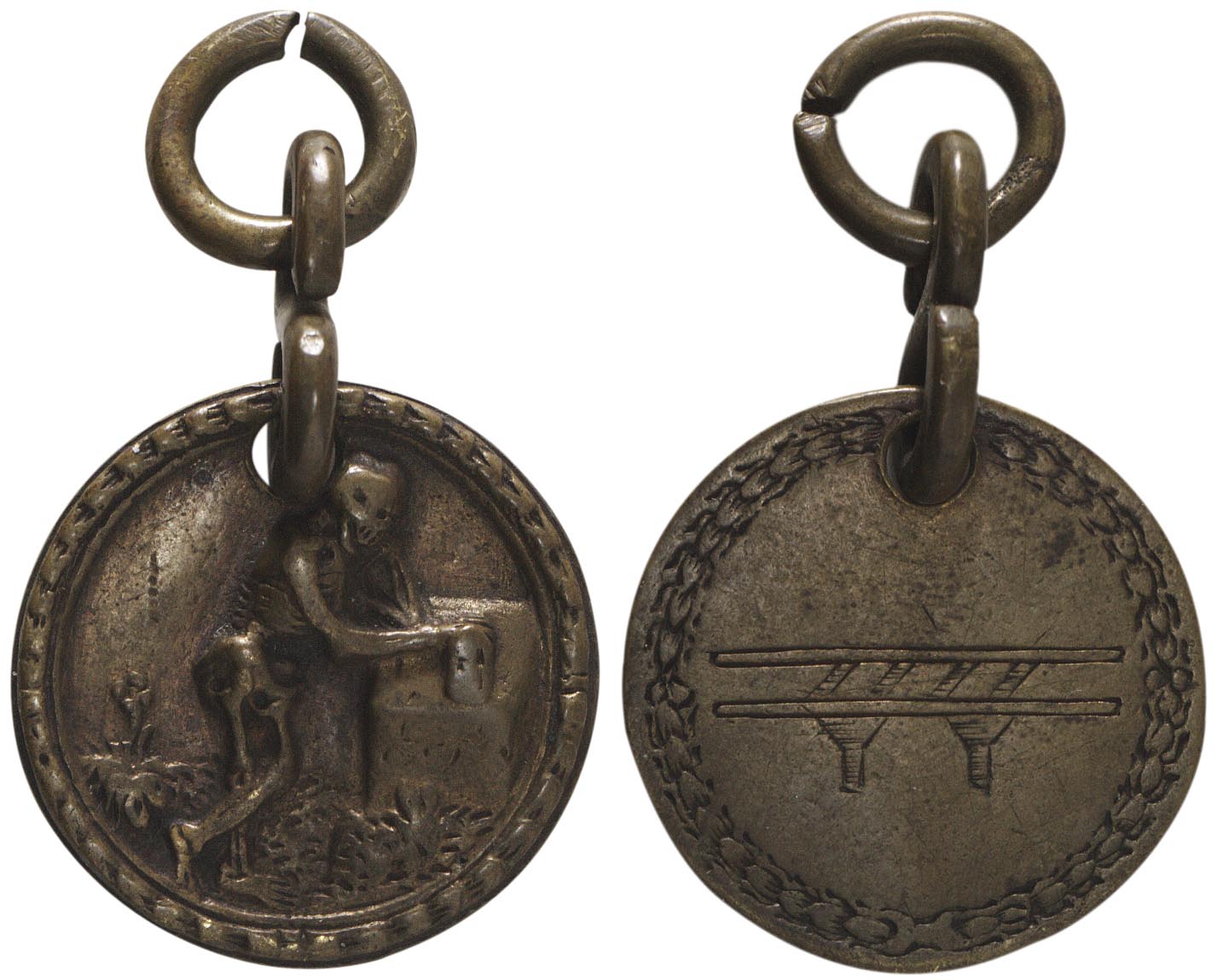 De penning is aan de bovenzijde doorboord en heeft 2 schakels, voor gebruik als draagteken.