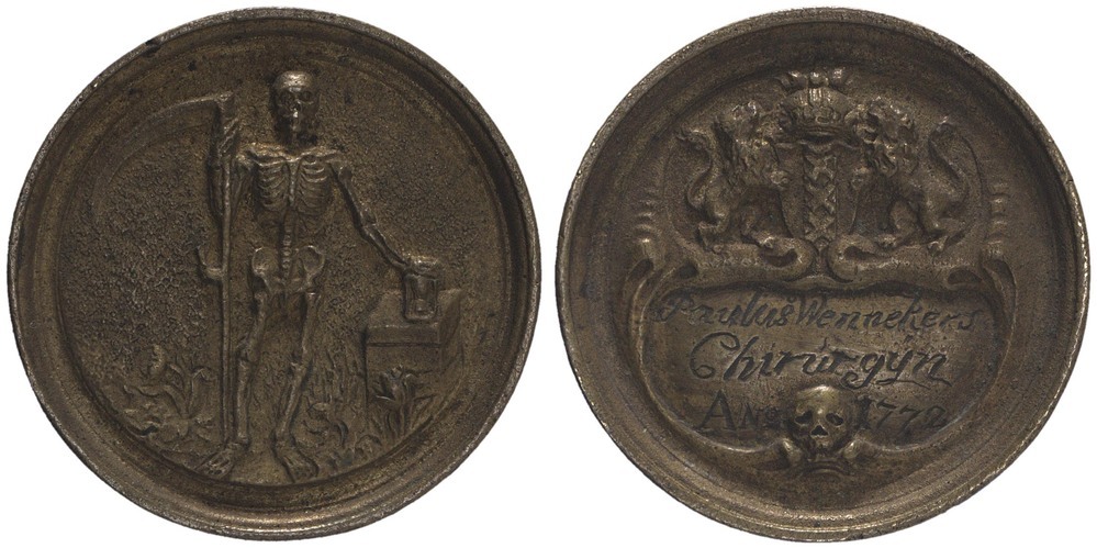 voorzijde: De dood als geraamte, en face, in de rechterhand een zeis, de linkerhand rustend op een zandloper, geplaatst op een altaar.