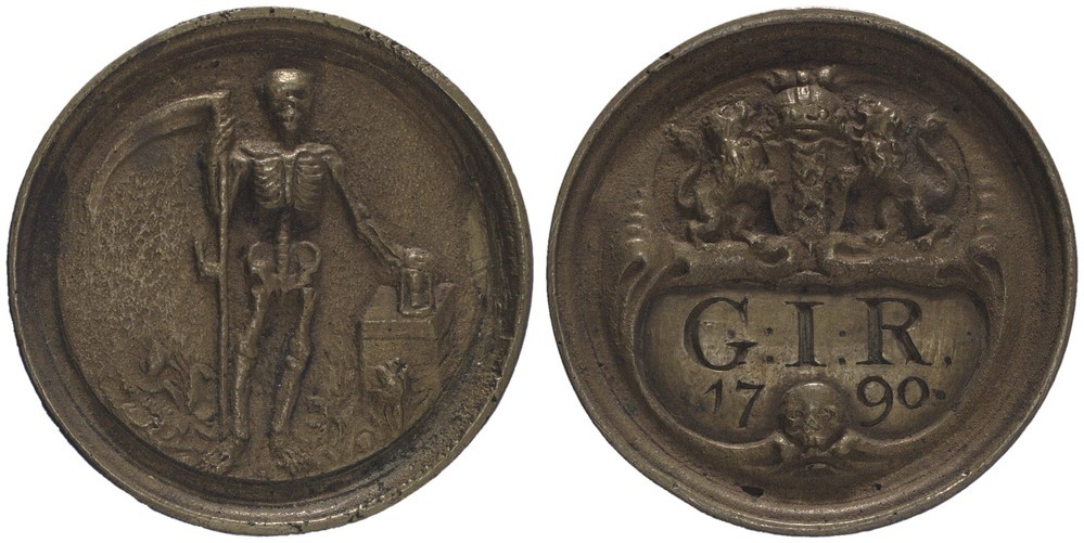 voorzijde: De dood als geraamte, en face, in de rechterhand een zeis, de linkerhand rustend op een zandloper, geplaatst op een altaar.