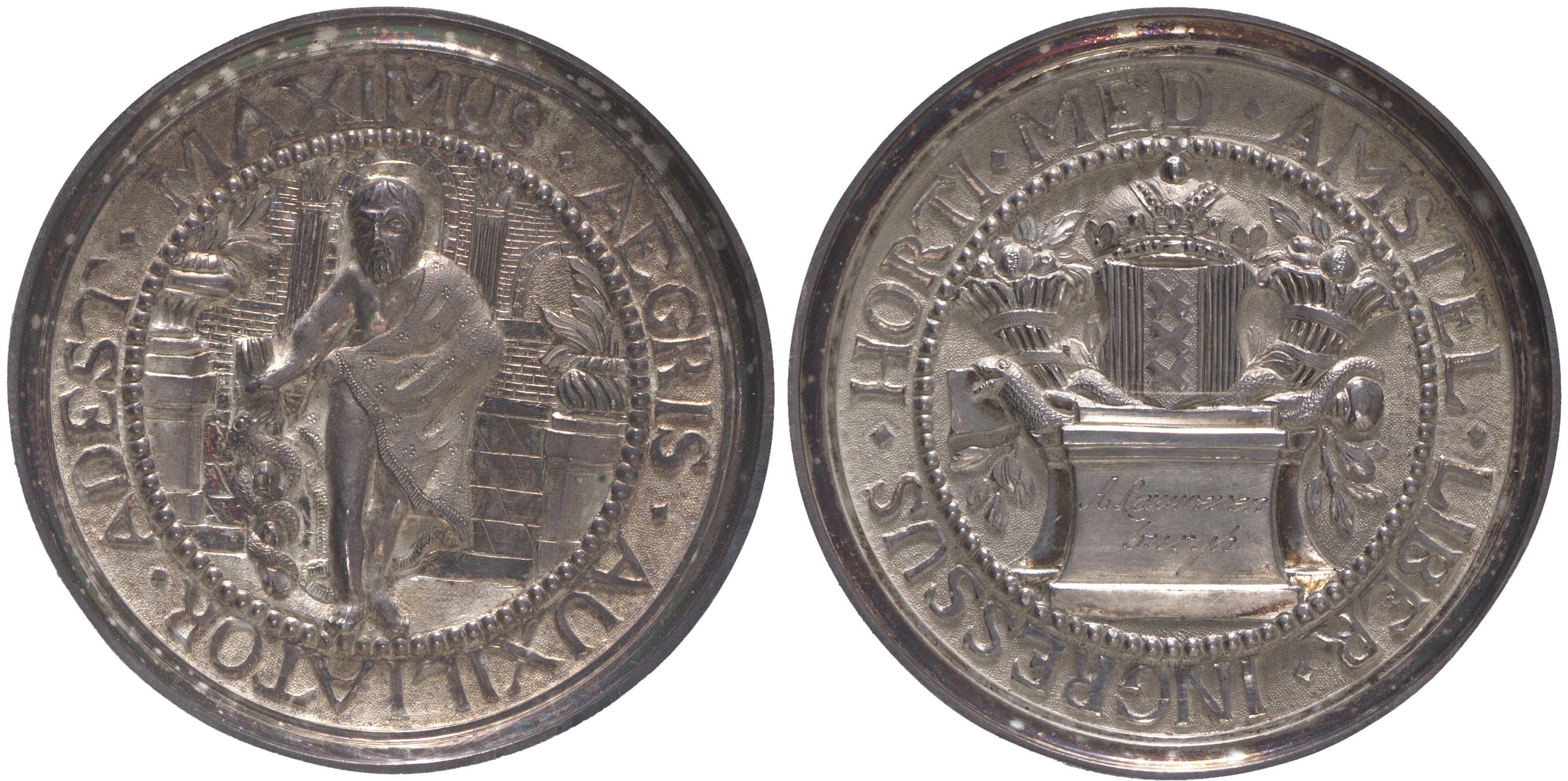 opschrift voorzijde omschrift: MAXIMUS . AEGRIS . AUXILIATOR . ADEST .