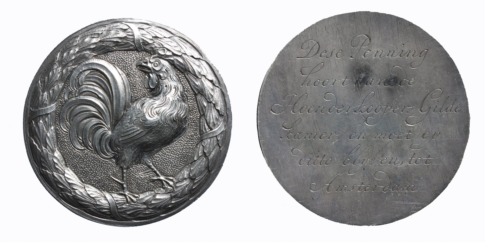 - opschrift keerzijde: Dese Penning / hoort aan de / Hoenderkoopers Gilde / kamer, en moet op / ditto blijven, tot / Amsterdam