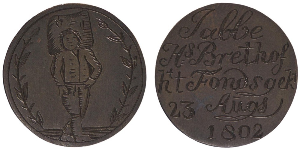 Korendragers- en korenstortersgilde t.n.v. Jabbe H(armanus) Brethof (1770-1847) ht t fonds gekt 23 augs. 1802, 1802 koper, metaal hoogte: 2.9 cm; breedte: 2.9 cm; diepte: 0.2 cm; gewicht: 9.06 gr; signatuur, datering keerzijde: Jabbe / Hs Brethof / htt Fonds gekt / 23 Aúgt / 1802