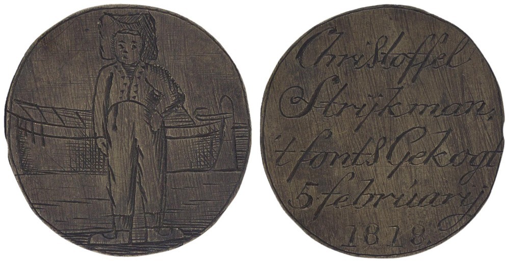 voorzijde: binnen een cirkelgroef een korendrager staand en face, linkerhand op de heup, achter hem een schuit. keerzijde: binnen een cirkelgroef een naam en datum.