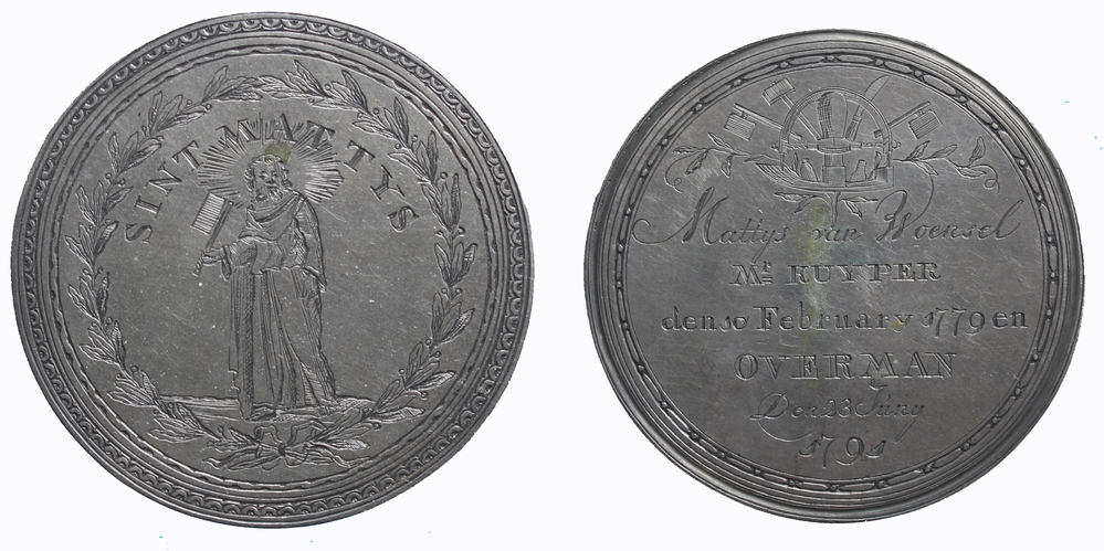 voorzijde: Sint Matthijs met stralenkrans en een kuiperbijl in zijn rechterhand. Daarboven in halfrond schrift SINT MATTYS, omgeven door een gestrikte lauwerkrans en een dubbele versierde golfrand.