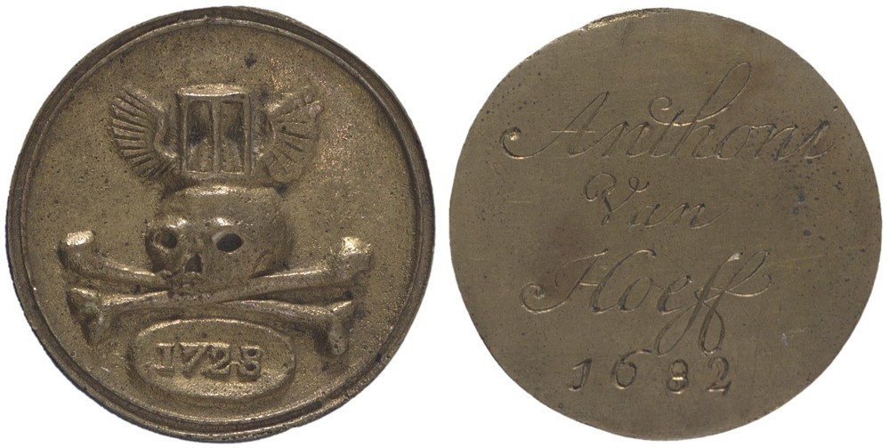 voorzijde: binnen een cirkelrand een doodshoofd onder een gevleugelde zandloper, liggend op twee gekruiste beenderen boven een ovaal met jaartal.
