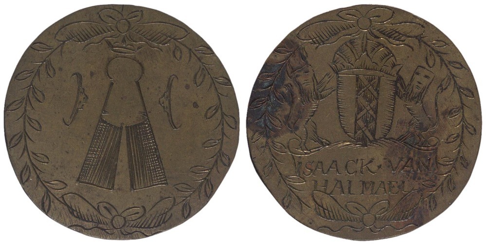 signatuur keerzijde op schild onder wapen van Amsterdam: ISAACK VAN / HALMAEL