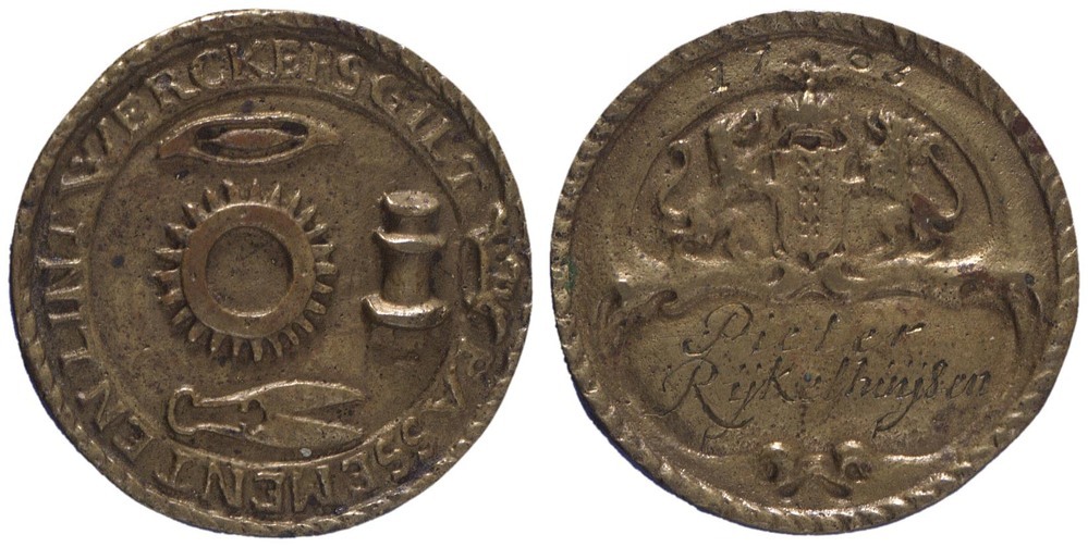 omschrift voorzijde op de cirkelband: PASSEMENT EN LINT WERCKERSGILT
