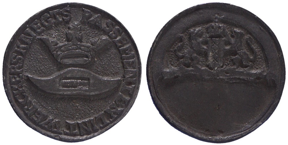 voorzijde: een omschrift. In het veld een gekroonde weversspoel. keerzijde: gekroond wapen van Amsterdam gehouden door twee leeuwen, waaronder een schild voor een gravure.- Trefwoorden