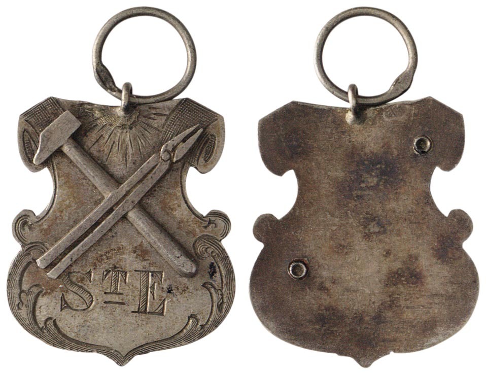 voorzijde: schildje, waarop gekruiste hamer en tang (aambeeldtang). keerzijde is leeg. Bovenaan een ring.- Trefwoorden