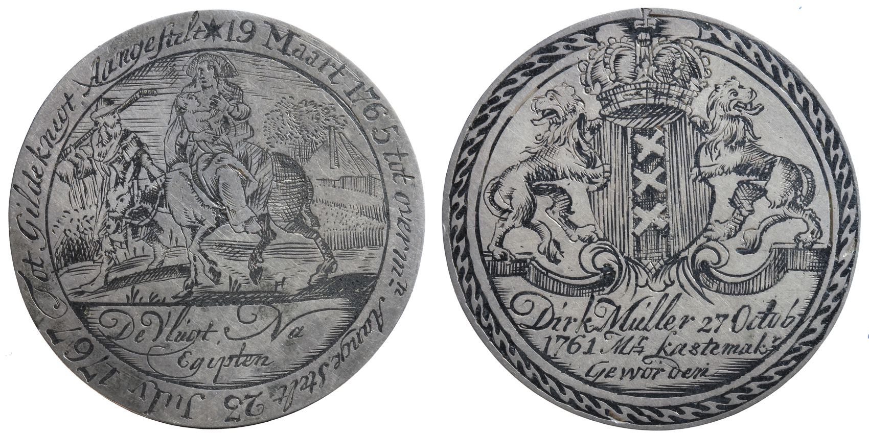 opschrift voorzijde onder het wapen van Amsterdam: Dirk Múller 27 Octob- / 1761 Mr kastemakr / Geworden