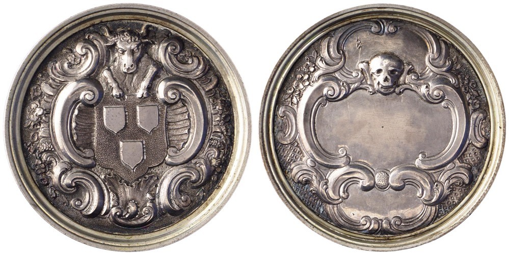 keerzijde: drie compartimenten voor inscripties, omgeven door rocailles. Boven het middelste compartiment een doodshoofd.