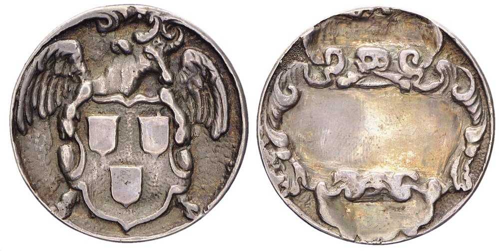 keerzijde: drie compartimenten voor inscripties, omgeven door rocailles. Boven het middelste compartiment een doodshoofd.