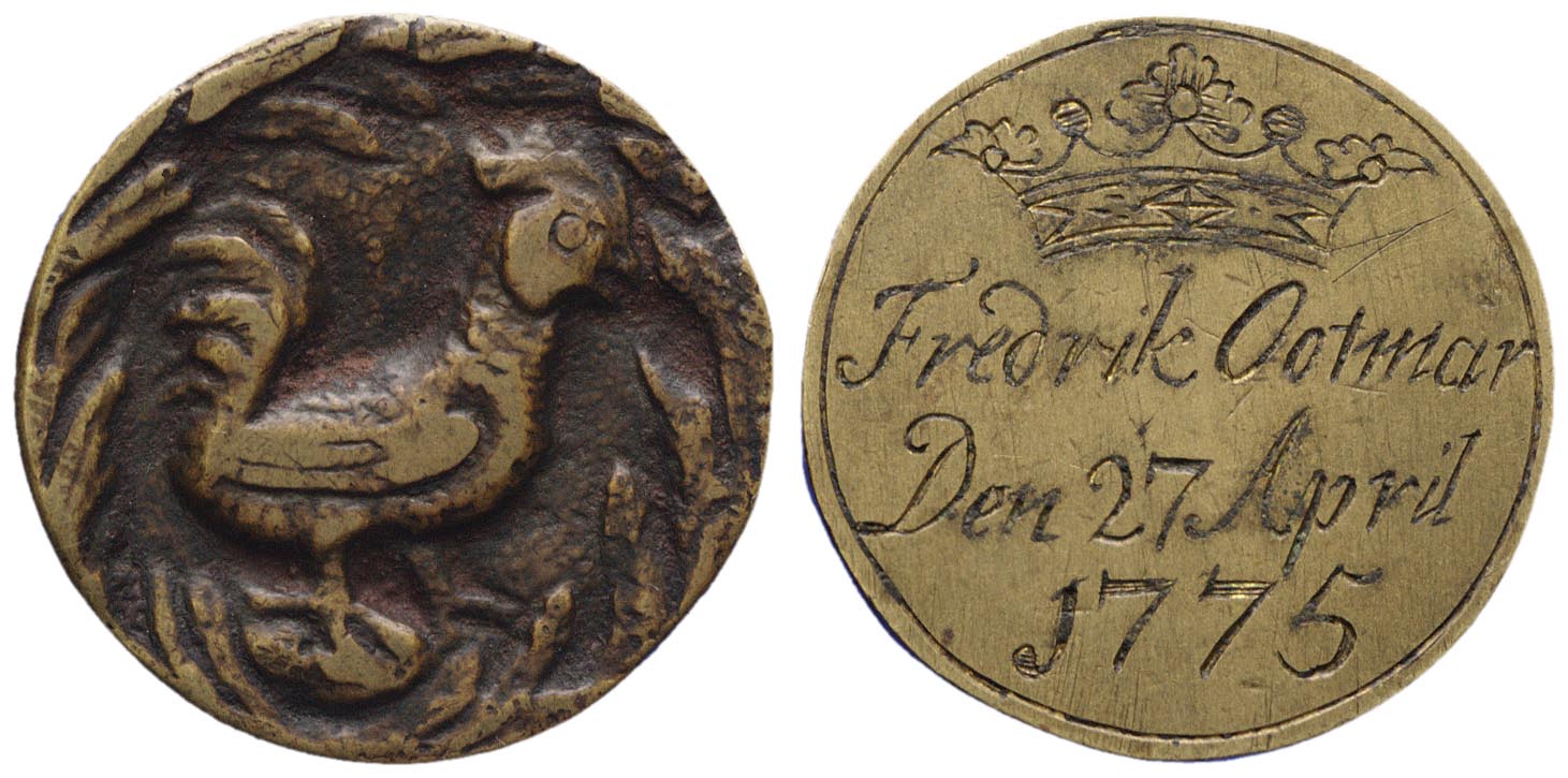 voorzijde: een haan omgeven door een bladrand. keerzijde: een kroon gegraveerd, daaronder een naam en datum, binnen cirkelgroef.- Trefwoorden