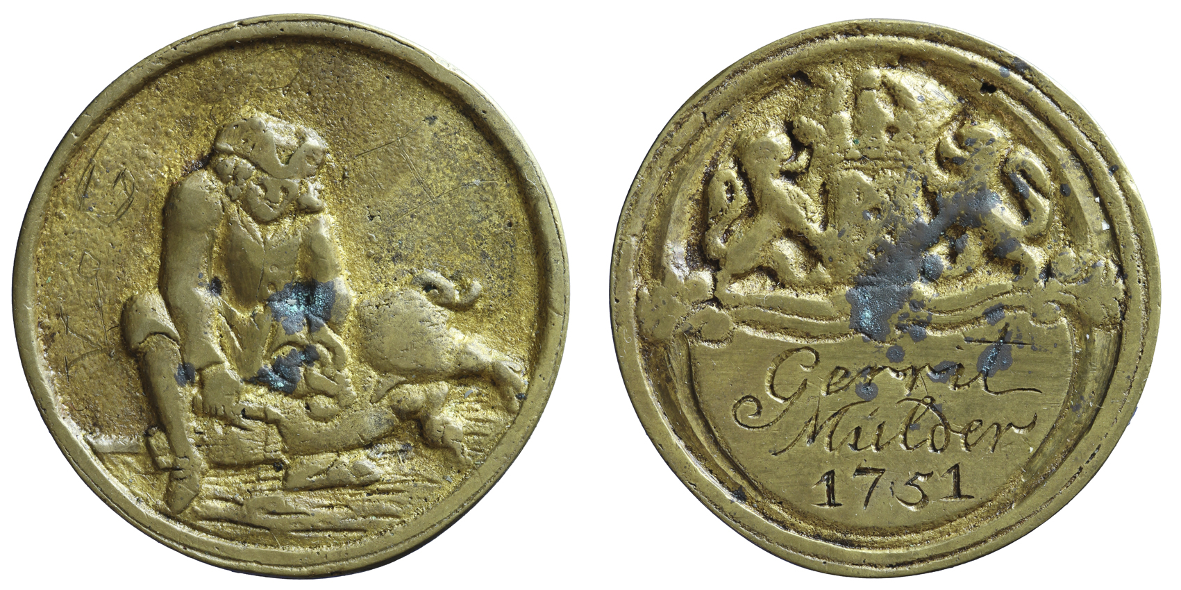 voorzijde: gekroond wapen van Amsterdam gehouden door twee leeuwen. Daaronder een veld met inscriptie. keerzijde: een man die een varken slacht.- Trefwoorden