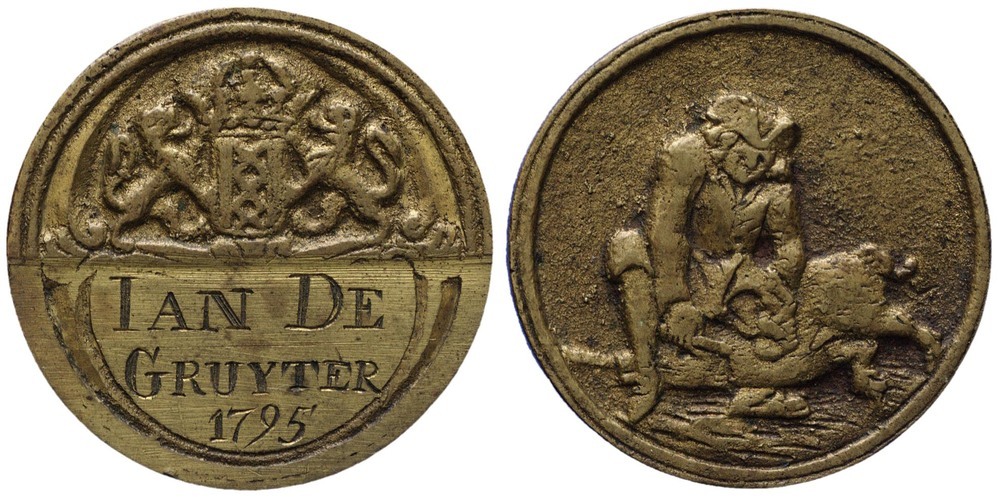 Spek- of varkensslagersgilde t.n.v. Jan de Gruyter (geb. 1758), 1795, 1795 koper, metaal hoogte: 4.0 cm; breedte: 4.0 cm; diepte: 0.3 cm; gewicht: 31.70 gr; signatuur, datering voorzijde: IAN DE / GRUYTER / 1795