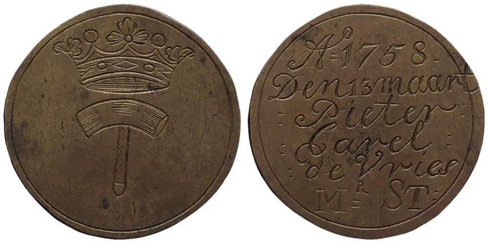 Metselaars-, steenhouwers-, leidekkers- en pompemakersgilde. Steenhouwers, t.n.v. Pieter Carel de Vries (1737-vóór 1784), mr. Steenhouwer, den 13 maart, a° 1758, 1758 koper, metaal hoogte: 3.7 cm; breedte: 3.7 cm; diepte: 0.1 cm; gewicht: 13.52 gr; signatuur, datering keerzijde: Aº = 1758 - / Den 13 maart / :Pieter: / :Carel: / :de Vries / MR= ST: