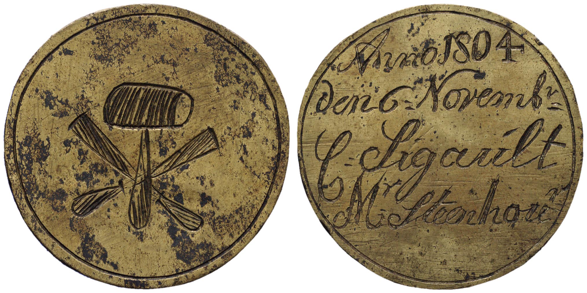 voorzijde: binnen cirkelgroef gegraveerd een steenhouwershamer en twee gekruiste beitels.
