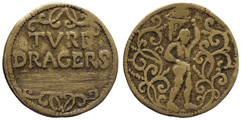 voorzijde: binnen parelrand de tekst TVRF - DRAGERS, boven en onder guirlandes. keerzijde: binnen parelrand een turfdrager tussen guirlandes.- Trefwoorden