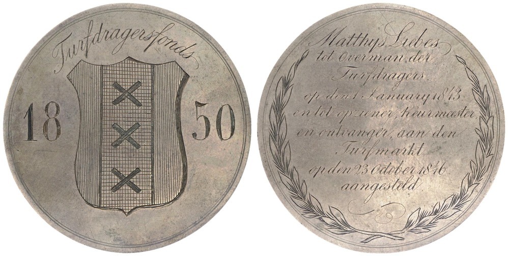 opschrift keerzijde: Matthys Liebes / tot Overman der / Turfdragers. / op den 1 January 1843 / en tot opziener, Keurmeester / en ontvanger, aan den / Turfmarkt / op den 23 October 1846 / aangesteld.