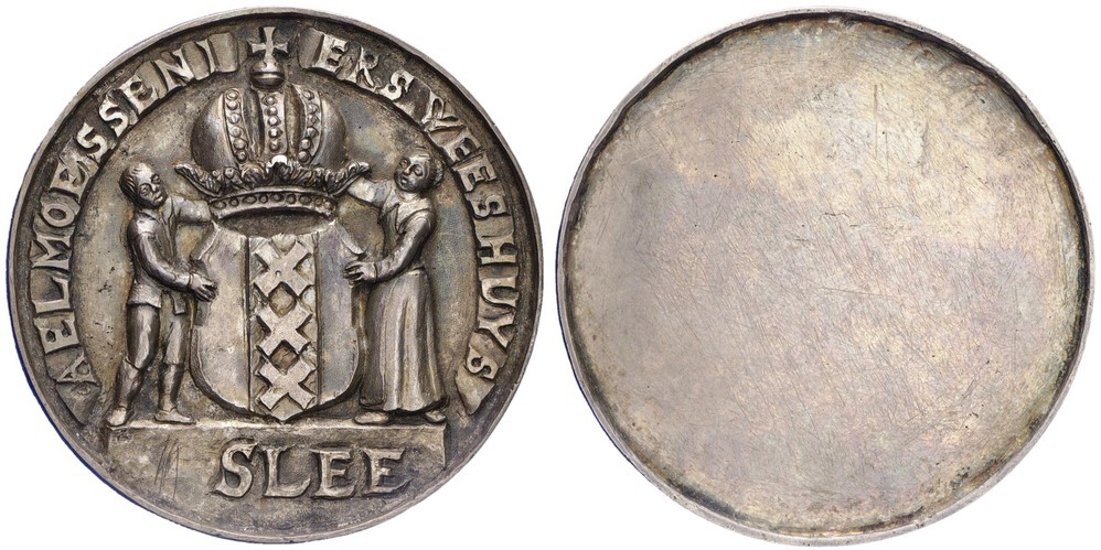 voorzijde: het gekroonde wapen van Amsterdam, gehouden door een weesjongen en een weesmeisje boven een veld met "SLEE". Omschrift.
