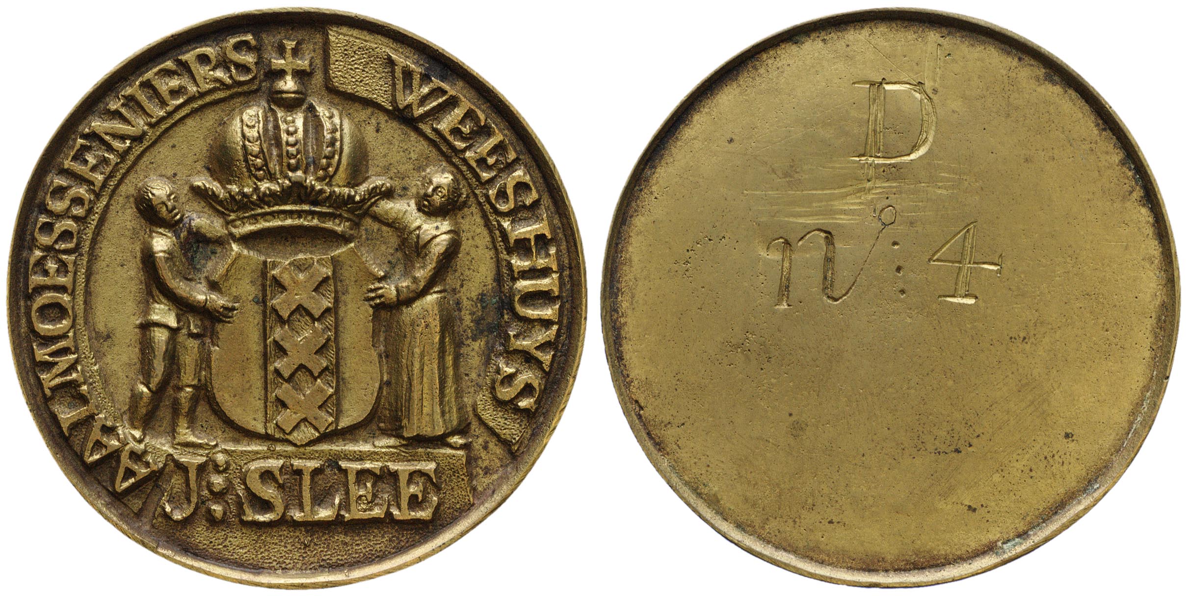 voorzijde: het gekroonde wapen van Amsterdam, gehouden door een weesjongen en een weesmeisje boven een veld met "J:SLEE". Omschrift.