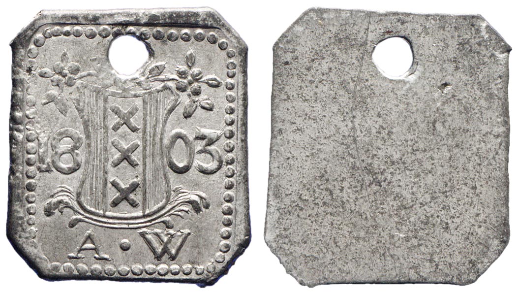 voorzijde: binnen een parelrand het wapen van Amsterdam, versierd met bloemtakken boven de letters A.W; een jaartal, bovenin een gat. keerzijde: onbewerkt.- Trefwoorden