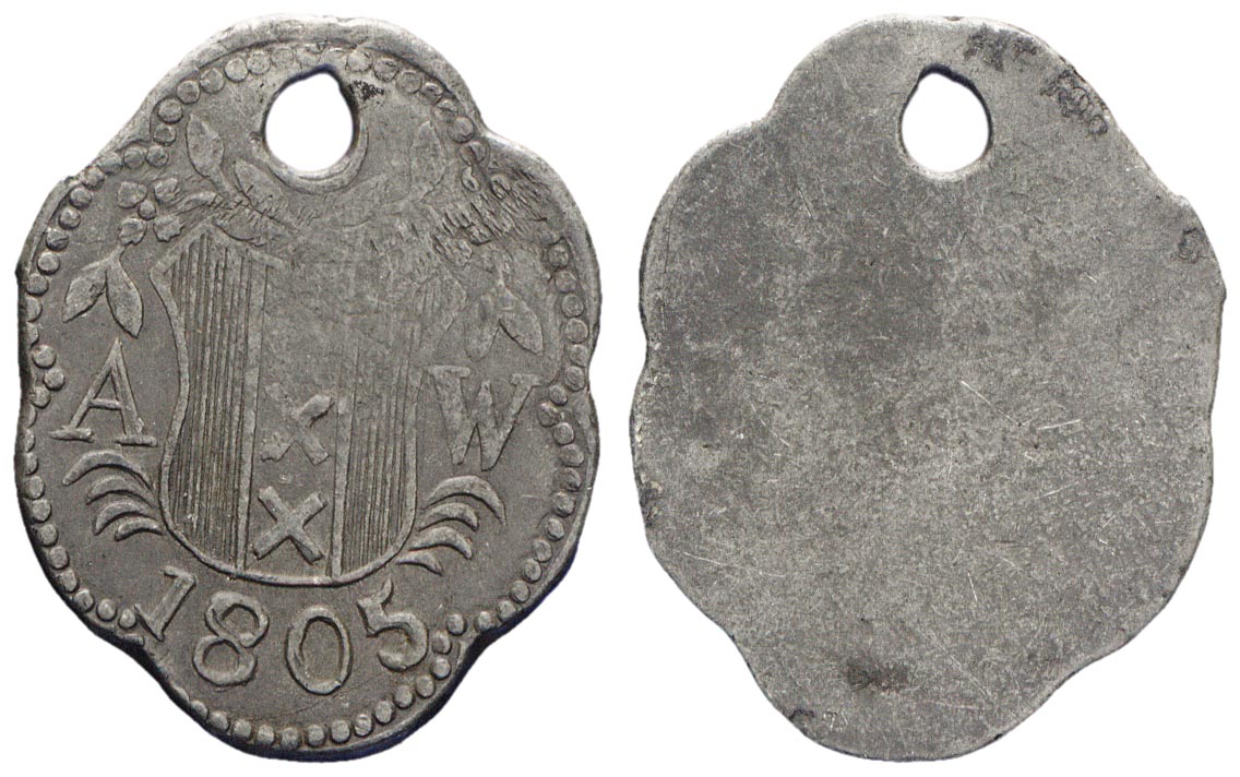 - Hondenbelastingpenning van het Aalmoezeniersweeshuis (1805), 1805