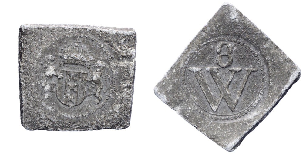 keerzijde: penning als ruit, waarbinnen een cirkelvormig parelsnoer waarbinnen "6W ".