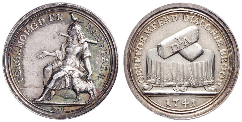 keerzijde: een tafel met gedrapeerd tafelkleed, daarop twee broden waarop de letters DIA. Omschrift. Onder de afsnede een jaartal.