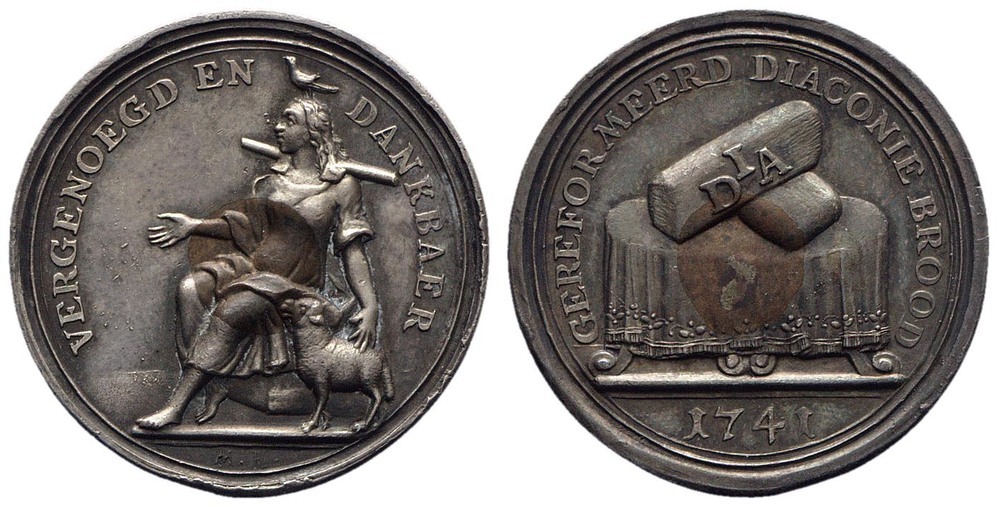 keerzijde: een tafel met gedrapeerd tafelkleed, daarop twee broden waarop de letters DIA. Omschrift. Onder de afsnede een jaartal.