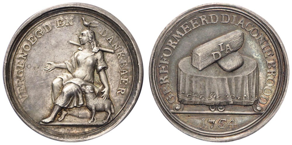keerzijde: een tafel met gedrapeerd tafelkleed, daarop twee broden waarop de letters DIA. Omschrift. Onder de afsnede een jaartal.