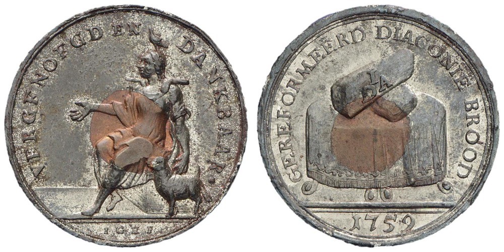 keerzijde: een tafel met gedrapeerd tafelkleed, daarop twee gekruiste broden waarop de letters DIA. Omschrift. Onder de afsnede een jaartal.