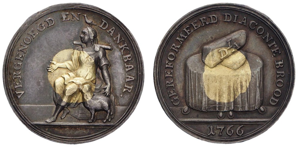 keerzijde: een tafel met gedrapeerd tafelkleed, daarop twee gekruiste broden waarop de letters DIA. Omschrift. Onder de afsnede een jaartal.