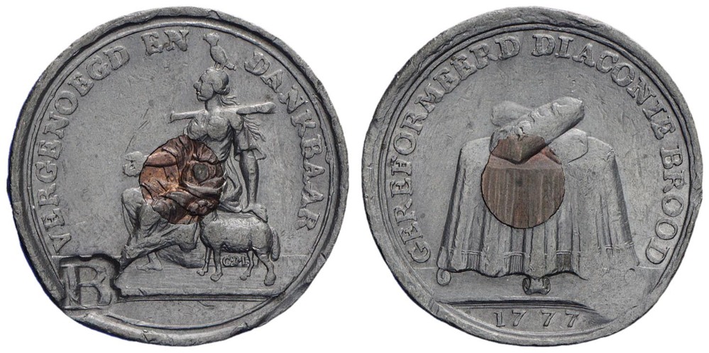 keerzijde: een tafel met gedrapeerd tafelkleed, daarop twee gekruiste broden waarop de letters DIA. Omschrift. Onder de afsnede een jaartal.
