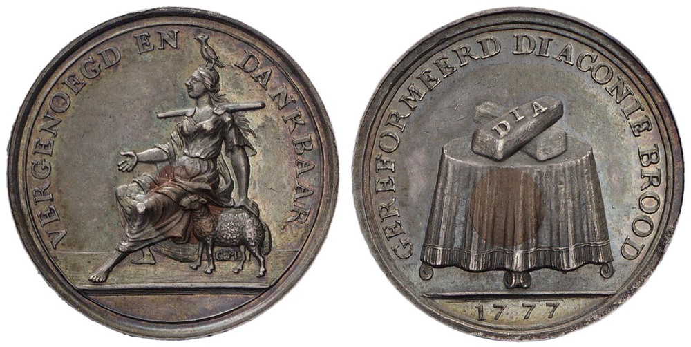 keerzijde: een tafel met gedrapeerd tafelkleed, daarop twee gekruiste broden waarop de letters DIA. Omschrift. Onder de afsnede een jaartal.