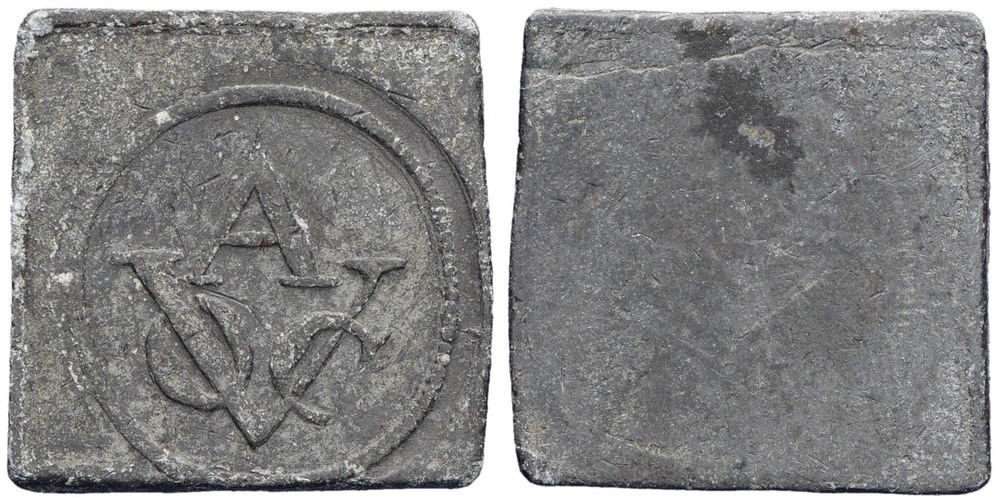 voorzijde: in een vierkant loden plaat een stempel van de VOC Amsterdam met parelrand. keerzijde is onbewerkt.- HerkomstCollectie S.H. van der Noordaa; veiling G.Th. Bom, 15 december 1856, nr. 3821, voor fl 1.
