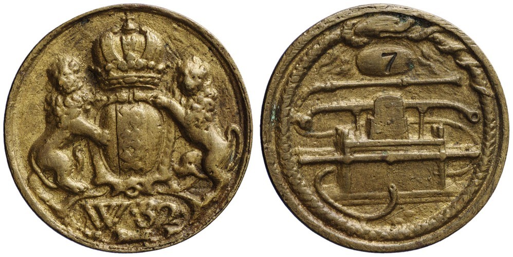 voorzijde: het gekroonde wapen van Amsterdam, gehouden door twee leeuwen. Onder het wapen een veld met W.32. keerzijde: een afbeelding van een brandspuit omgeven door een Ouroboros, bovenin een nummer.- Trefwoorden