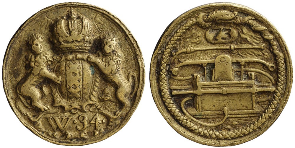voorzijde: het gekroonde wapen van Amsterdam, gehouden door twee leeuwen. Onder het wapen een veld met W.34. keerzijde: een afbeelding van een brandspuit omgeven door een Ouroboros, bovenin een nummer.- Trefwoorden