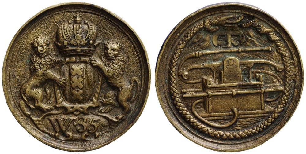 voorzijde: het gekroonde wapen van Amsterdam, gehouden door twee leeuwen. Onder het wapen een veld met W.35. keerzijde: een afbeelding van een brandspuit omgeven door een Ouroboros, bovenin een nummer.- Trefwoorden