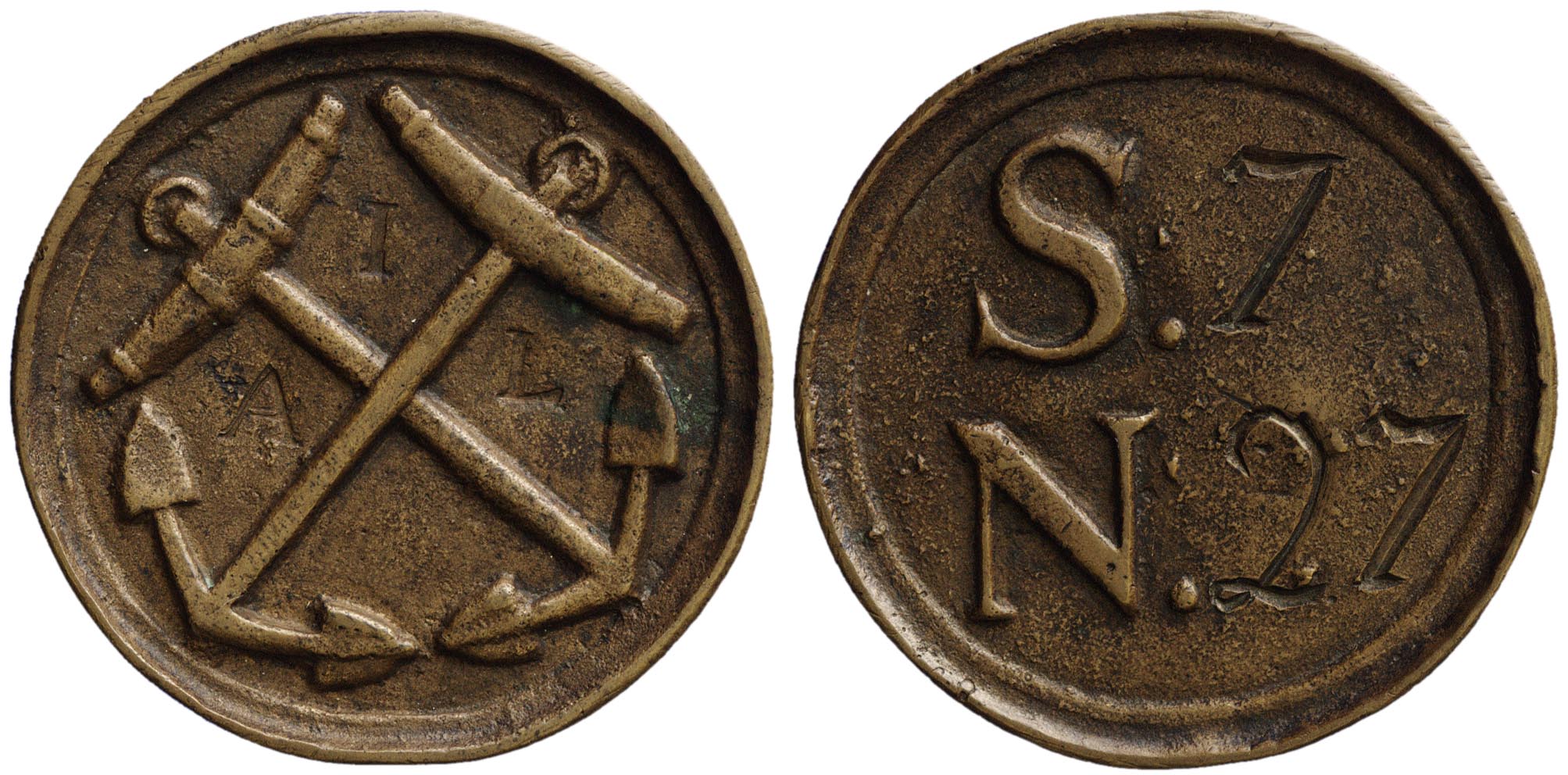voorzijde: twee gekruiste ankers met letters. keerzijde: letters en nummers.- Trefwoorden