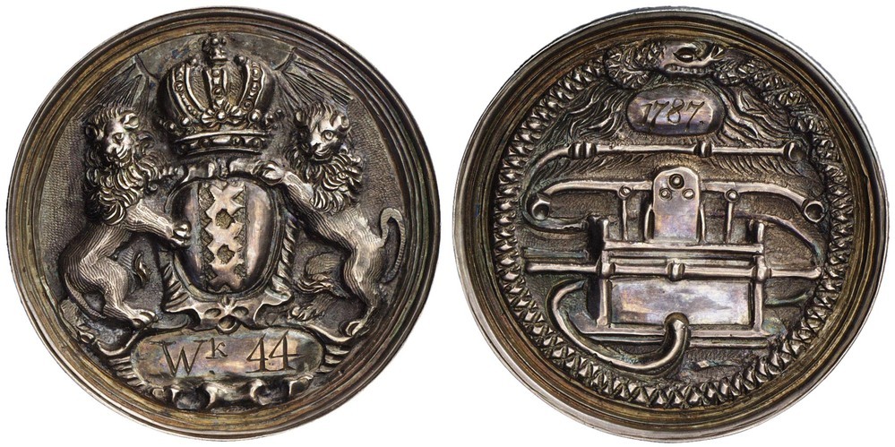 voorzijde: het gekroonde wapen van Amsterdam, gehouden door twee leeuwen. Onder het wapen een veld met Wk 44.