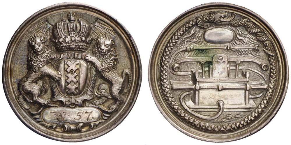 voorzijde: het gekroonde wapen van Amsterdam, gehouden door twee leeuwen. Onder het wapen een veld met W:57.