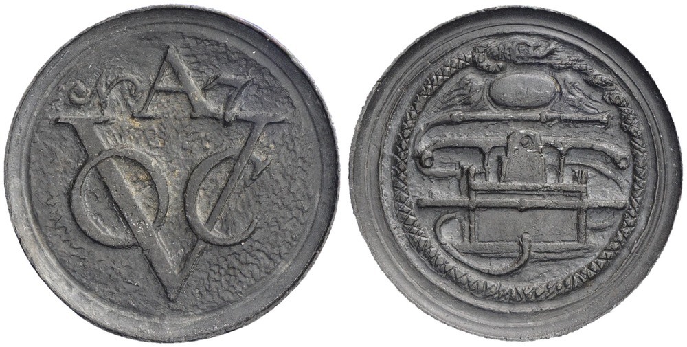 voorzijde: monogram van de VOC Amsterdam. keerzijde: brandspuit met draagbaar, omgeven door een Ouroboros, bovenin een leeg veld.- Trefwoorden