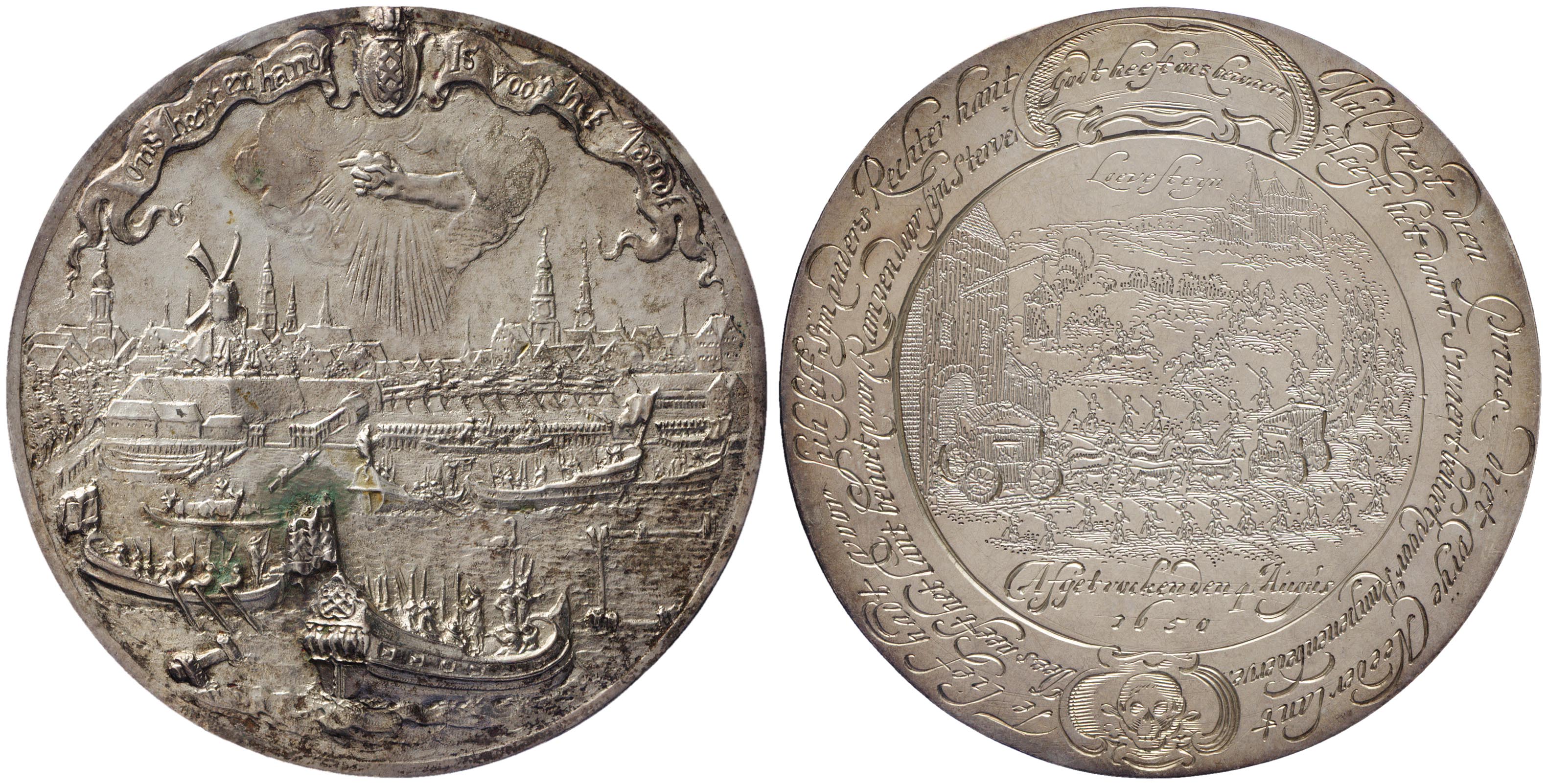 voorzijde: verscheidene vaartuigen op de Amstel met gewapende burgers. Op de achtergrond de stad Amsterdam; hierboven een wolk waaruit een hand steekt die een hart vasthoudt. Daarboven een wimpel met de spreuk met een gekroond wapen van Amsterdam